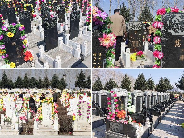 市民在吉林省长春市卧龙寿明园祭扫亲友(拼版照片,4月1日摄),许多违规修建的“活人墓”夹杂在合法墓地之间。
