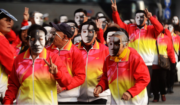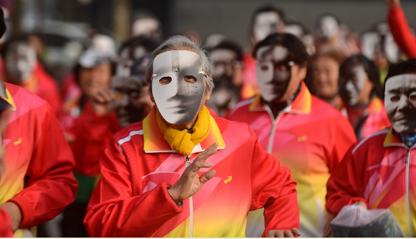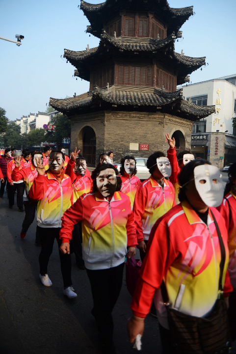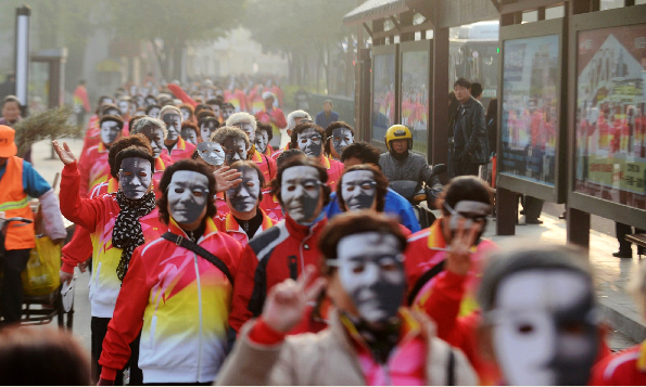 4月2日,在江苏扬州瘦西湖畔,人们佩戴诗人脸谱面具跑步。