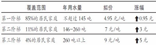 分析:该方案适当扩大第一阶梯居民家庭的覆盖面,但提高了调价幅度。同时对6%用水较多和4%用水最多用户,实行差别化水价。