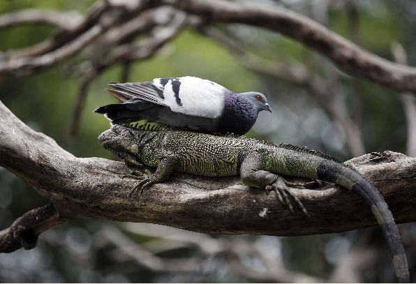 4月3日,在厄瓜多尔城市瓜亚基尔一处公园内,一只鸽子停在鬣蜥的背上休息。