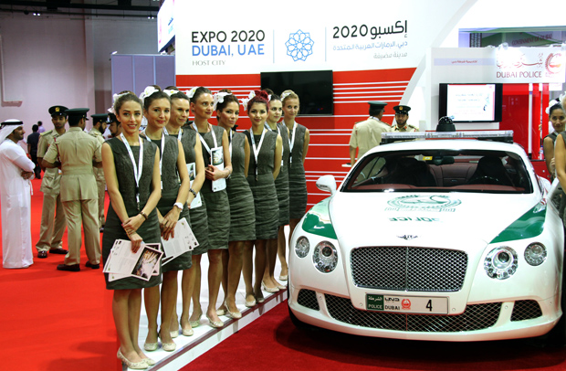 4月8日,在阿联酋迪拜,礼仪小姐站在迪拜警察局展示的警车旁。