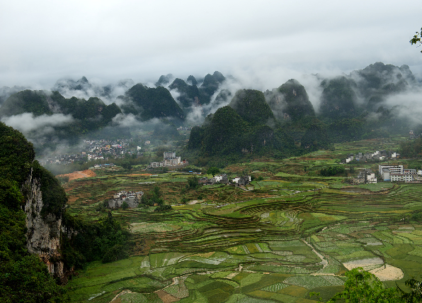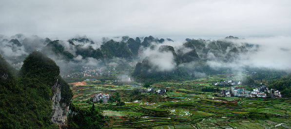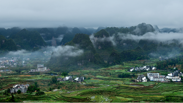 4月9日,一场大雨过后,广西东兰县泗孟乡山峦叠嶂,白雾缭绕,田园间农舍点点,美如仙境。