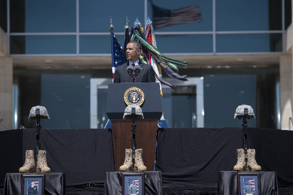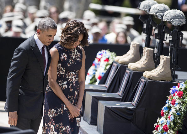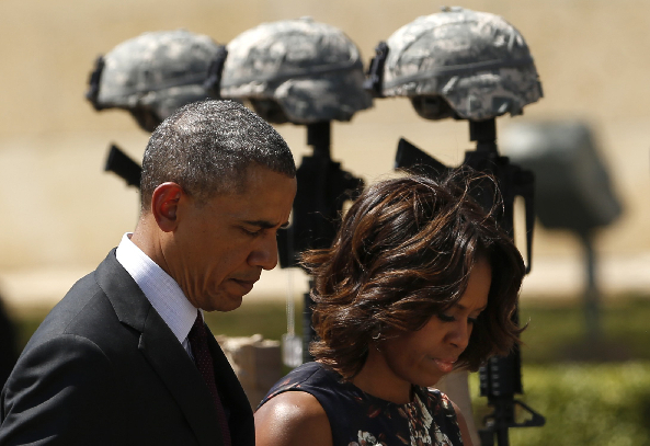 4月9日,在美国得克萨斯州胡德堡军事基地,美国总统奥巴马(左)和夫人米歇尔参加枪击案遇难者悼念仪式。