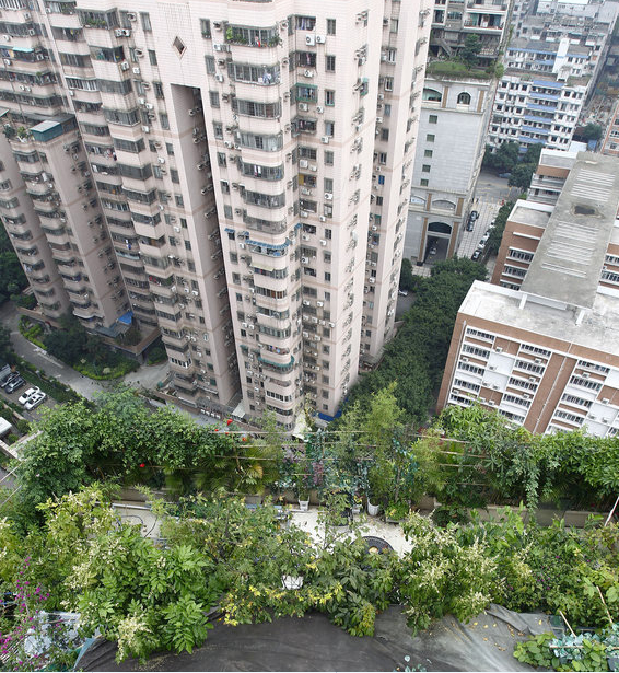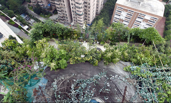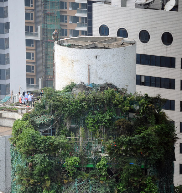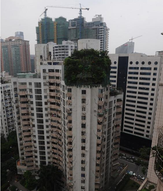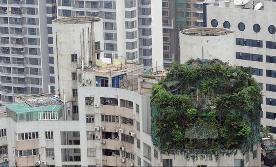4月10日消息,广州。近日,记者接到读者陈先生报料,住在天河北林和东路的他,看见附近某小区楼盘顶层盘踞着一团异常茂密的“绿色植物”,“远看像是天台的花花草草太过繁茂,但走近一看,却很像是一个用绿色植物做‘掩护’的违章建筑。”