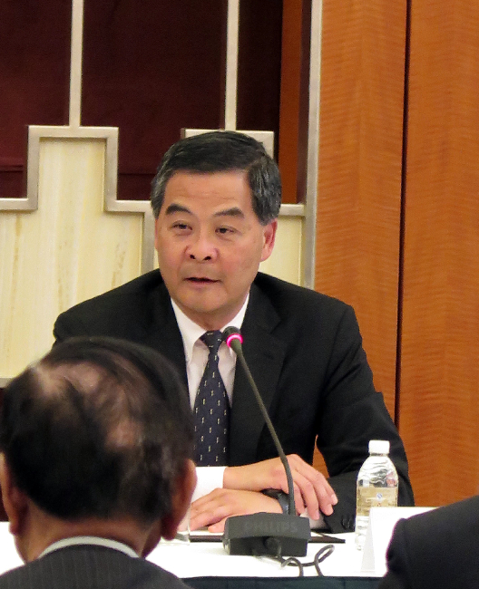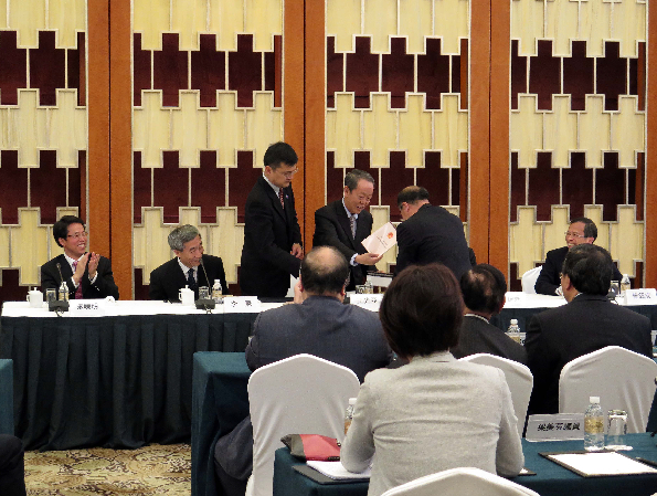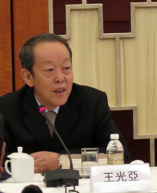 香港立法会访沪 王光亚回赠议员基本法。香港特区立法会访问团一连两日访问上海。13日下午,50多位立法会议员在入住酒店与国务院港澳办主任王光亚(中)、全国人大常委会副秘书长兼香港特区基本法委员会主任李飞(左二)、中央驻港联络办主任张晓明(左一)座谈。座谈会由立法会主席曾钰成(右一)主持,香港特首梁振英(右二)亦有出席。图为王光亚向以物品或书面形式表达诉求的议员回赠基本法。香港中通社图片