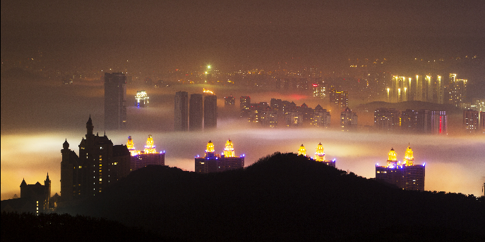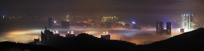 这是4月13日在辽宁省大连市拍摄的平流雾夜景。
