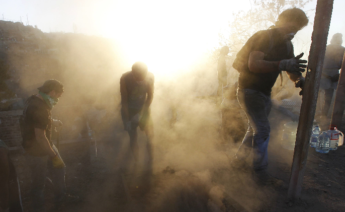 4月14日,在智利瓦尔帕莱索,人们在被烧毁的房屋残骸中收集物品。