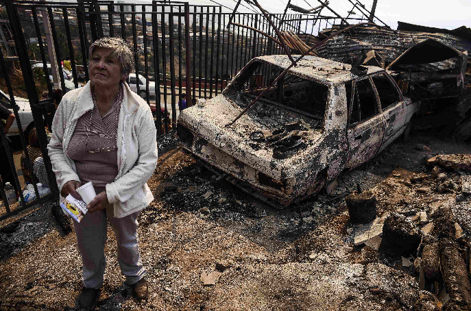 4月14日,在智利瓦尔帕莱索,一名女子站在火灾废墟前。