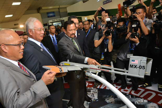 4月14日,在马来西亚吉隆坡,汶莱苏丹哈桑纳尔(左三)与马来西亚总理纳吉布(左二)参观防务展。
