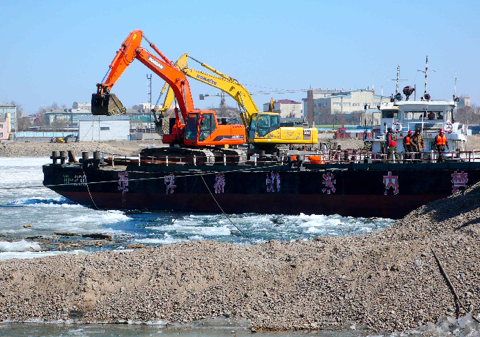 4月15日,中国籍装载机在拆卸中俄界江黑龙江黑河段冬季客货运输使用的浮箱固冰通道。