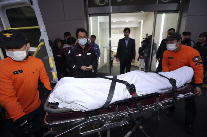 4月17日,在韩国木浦的一家医院,救援人员搬运韩国“岁月”号客轮一名遇难乘客的遗体。