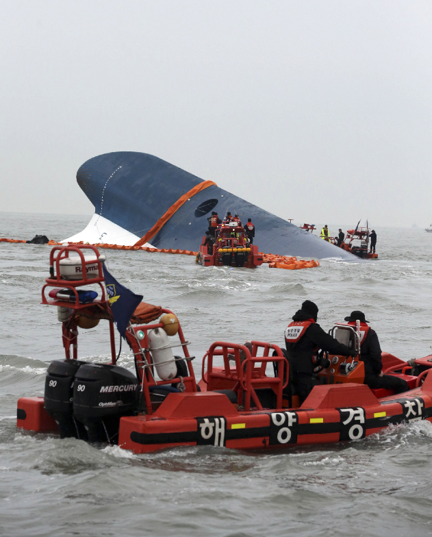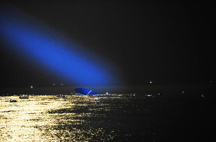 4月17日,救援人员在韩国全罗南道珍岛附近海域搜救“岁月”号客轮的乘客。