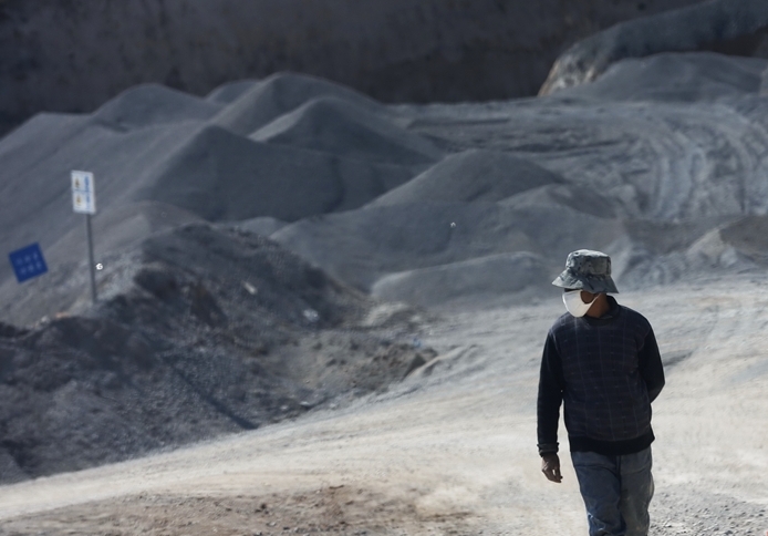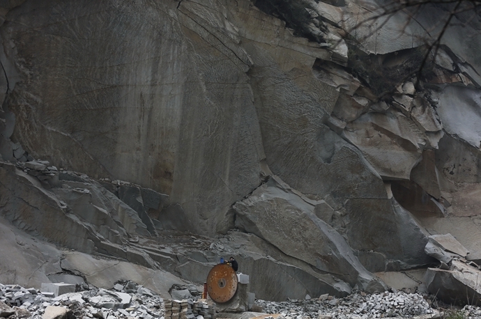 华阴市大敷峪202省道旁,一名工人在山下用盘锯正在切割石料。大敷峪山体经过多年石料开采已经变的千疮百孔,多个山头被削平。 本报记者邓小卫 文/图