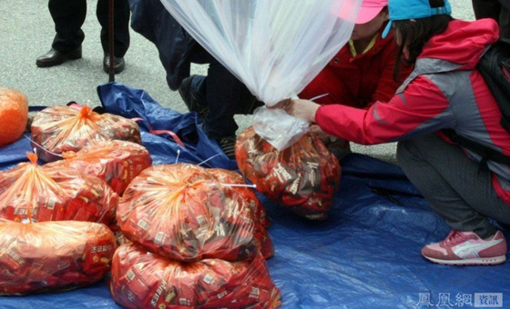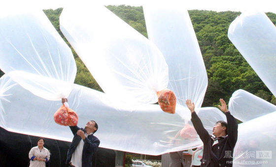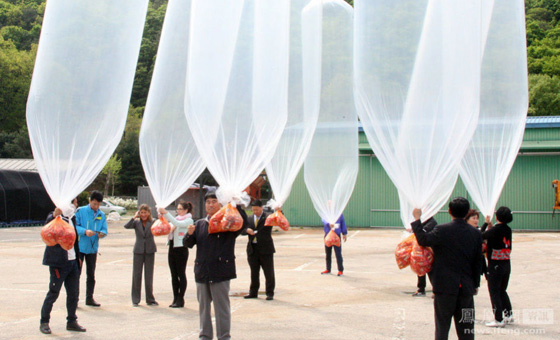韩国民众用气球向朝鲜发放巧克力派