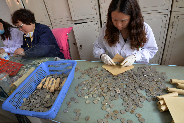 4月29日,邯郸市公共交通总公司票务中心点钞中队的点钞员在整理残币。