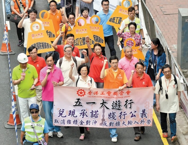 工联会昨早在湾仔修顿球场集合,再游行至政府总部,大会声称有近5000人参加游行,当中包括近百个工会参与。工联会更特制一张大型明信片,收集工友签名,再寄给政府,希望政府聆听工友的声音。吴秋北称,今年的五一国际劳动节大游行提出多项诉求,当中包括反对扩大输入外劳、取消强积金对冲机制、立法订立标准工时、争取中央职业保险补偿基金、最低工资一年一检、完善退休保障制度。工联会立法会议员陈婉娴表示,现时有工商界透过议会,要求输入外劳,即是变相伤害劳工。她又称,现时的强积金对冲机制将工人的退休金「冲走」,令他们退休后无保障;而且很多工种都工时长,经常要加班,但无「补水」,认为没有标准工时对他们不公道。