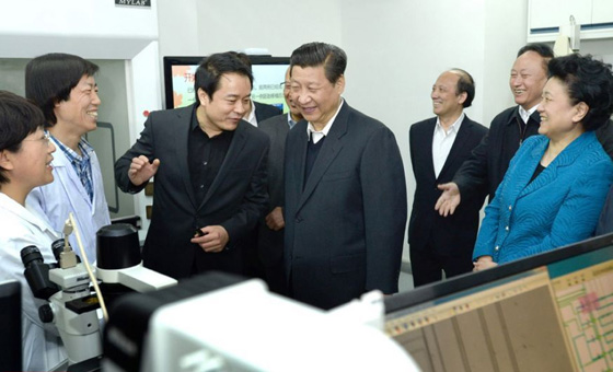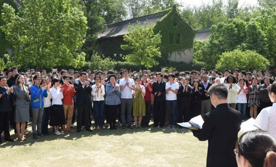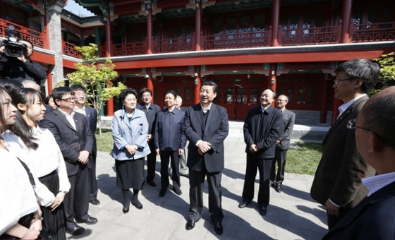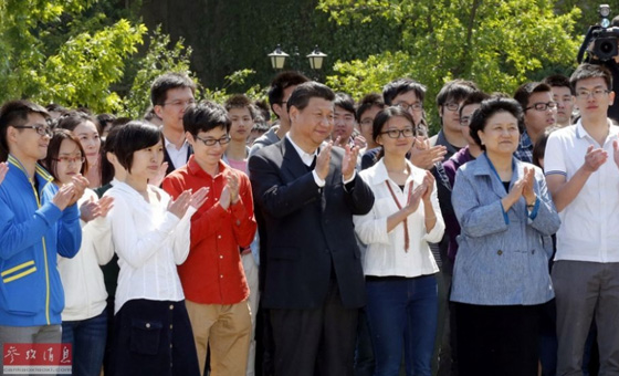 5月4日,中共中央总书记、国家主席、中央军委主席习近平在北京大学考察。这是习近平在校园观看北大师生纪念五四运动95周年青春诗会时同朗诵者亲切交谈。新华社记者马占成摄