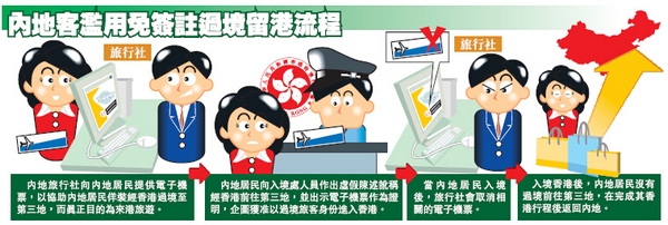 入境处助理处长(执法及遣送审理)冯伯豪昨日召开记者会讲述案情时表示,现时内地旅客如要来港旅游或公干,需要向内地相关出入境部门申请「前往港澳通行证(俗称双程证)」,并要附有赴港签注,始能来港。但是,内地居民如果是前往其他国家或地区,只需持中国护照及取得目的地签证便可,而且取道到港澳地区转机时,同时可以获得免签证过境逗留7天,有关规定却被人「钻空子」。