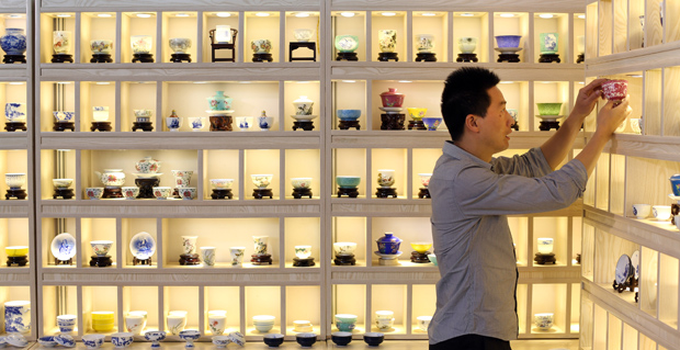 5月29日,一位参观者在博览会上观看茶具。