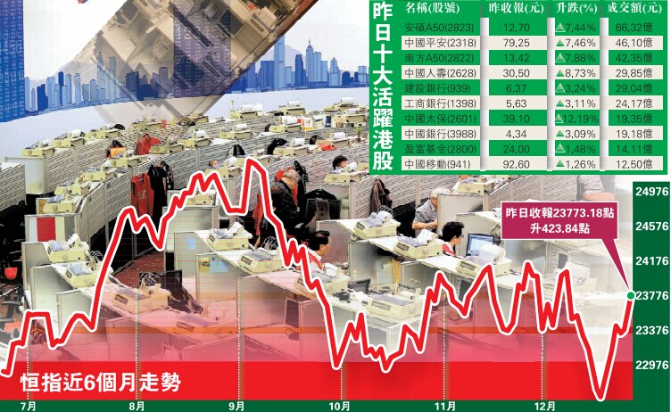 【香港商報網訊】記者林德芬報道:臨近期指結算日,在外圍及內地股市表現強勁帶動下,加上人行變相「降準」釋放流動性,港股昨日於聖誕假期後顯著造好,恒指全日升423.84點或1.82%,收報23773.18點,成交804.2億元;中資金融股成升市火車頭,國指全日升461.73點或3.99%,收報12019.75點。