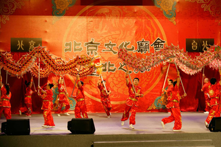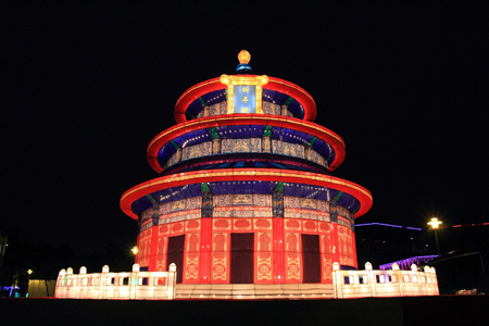 台北市会展产业发展基金会27日晚间在花博舞蝶馆举办「北京文化庙会.台北之旅」。天坛主灯、京味小吃、宫廷工艺遍布展场,让民众一同体验北京传统庙会及元宵灯节。