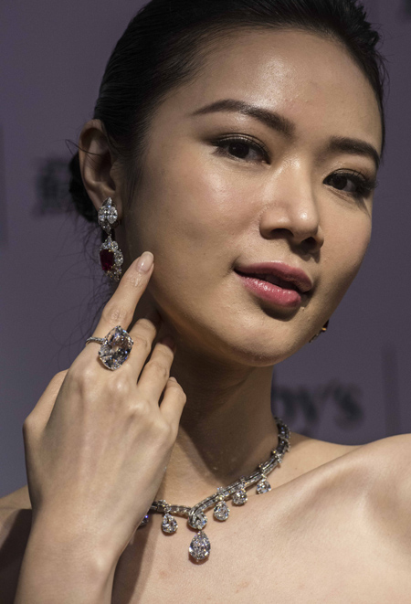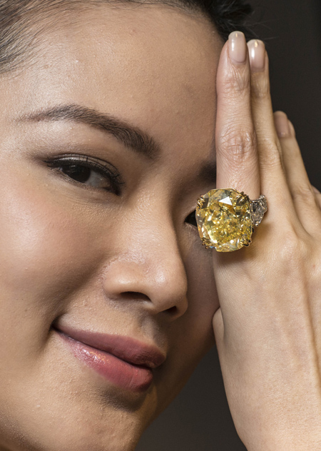 3月19日,模特展示一枚23.15克拉足色全美“戈尔康达传奇”钻石戒指,估价为3400万至4000万港元。