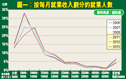 查本港就業人口的職業收入,從圖一可見,比較最低工資生效前後,結構上明顯向好的方向發展(所比較的,是2006年至2008年與2011年至2013年,即是最低工資生效前和最低工資生效後,中間撇除了較受金融海嘯影響的期間,以免數字因經濟波動而受幹擾)。可以看到,收入較低的群組,明顯地大幅減少,尤其是月入介乎5000至1萬元的,佔比由此前超過30%,短短兩年間急降至近20%(月入少於5000元的,多數從事半職工作,故此數字較易受工時而非工資所影響);比較而言,沒有最低工資之前,有關佔比雖然有所下降,不過降幅絕對不可相提並論。