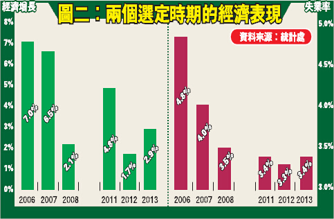 圖二所示,就是兩段時間的經濟增長和失業率數據。的確,2006年至2008年間,本港GDP年均增長約達5%,比較2011年至2013年的3%左右還要高,可是整體來說,前一時期的戶員卻無法有效分享有關成果,由低收入的到高收入的,其收入增長反過來都不及後一時期,顯示最低工資的確有助戶員爭取更佳回報。不過,當加入失業率這個因素考慮後,2006年的失業率達4.8%,2007年降至4%,2008年進一步跌到3.5%,這很大程度解釋了期內工資增長較慢的問題,因為在過多勞動力需要消化的情況下,工資上調的誘因並不太大;相反,2011年至2013年間,本港的失業率都徘徊於3.3%的低水平,即近全民就業的水平,這意味勞動供應非常緊張,工資本來就存在上調壓力,最低工資某程度可能是「生逢其時」罷了。最低工資生效後的加薪潮流,可能只跟最低工資本身存在「巧合」而非「因果」的關系——雖則,其對低收入人士及收窄貧富差距的作用還是不能抹殺的。