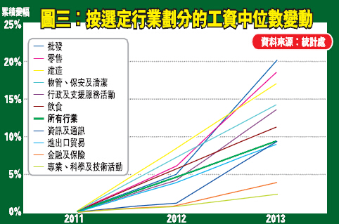 查不同行業的每小時工資中位數變化,就反映了勞動力供求關系的重要性。首先,受惠最低工資,每小時工資中位數本來較低的行業,包括每小時只有30元左右的物管、保安及清潔,2011年至2013年間的累積薪酬增幅,便高逾14%,明顯高於全港平均的9.5%。然而,不但受惠最低工資,同時還受惠旅遊業的行業,尤其是零售、批發,期間的薪酬增幅就高約20%。相對而言,本來工資較高的行業,例如金融、專業、科學及技術等,則無疑遠遠跑輸大市,只錄得2%至4%的增長。也就是說,這個時期,似乎販賣勞力比販賣知識更加劃算,與一般的常識理解大相逕庭。