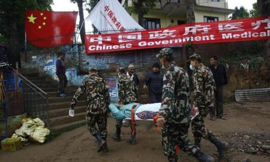 上月25日,尼泊爾發生8.1級大地震,至今已奪去超過七千人的生命。上月28日,在尼泊爾首都加德滿都以北30公里的杜里凱爾鎮,尼泊爾士兵運送一名傷者到中國政府醫療隊接受救治。中國政府醫療隊27日早抵達尼首都加德滿都后立即為災民提供醫療救援,迄今已收治百餘名傷病員。