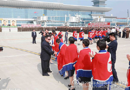 【朝鲜女足夺冠凯旋 金正恩接机20万市民夹道欢迎】2015年8月10日,据朝鲜中央电视台报道,朝鲜最高领导人金正恩携夫人李雪主亲自前往平壤顺安国际机场迎接在东亚杯女足比赛中三战全胜夺冠的朝鲜女足代表队凯旋。女足队员见到朝鲜最高领导人金正恩,激动不已,失控泪崩。
