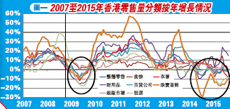 由廣東道「驅蝗」到去年雨傘運動及一系列新界北的「光復行動」,誰最受影響?當然是零售業。不過,回頭想想,零售業不景氣一定是因為這些行動的影響嗎?若內地客主要是購入貴價品的話,看看圖一的零售分類增長,珠寶首飾類早已在去年第二季出現收縮,最差曾經按年跌近三成。若以由升轉跌的趨勢計起,2011年6月以至2013年7月可算較為顯著,由此可見,貴價零售業進入寒冬並不是近月的事。換句說話講,雖然最近一年一眾大型連鎖店才高叫救命,但內里應有更多因素影響到現時香港零售業下滑以至經濟問題。