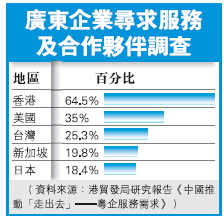 據香港貿發局早前進行的有關粵企「走出去」及「轉型升級」調查顯示,多達91%的受訪企業表示會在「走出去」過程中尋求合作夥伴,其中約有65%的企業表示尋求合作夥伴時最有興趣選擇香港企業,數字遠較選擇美企的35%及選擇台企的25.3%為多(詳見上表)。
