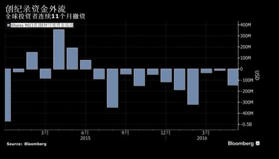 從去年6月底以來的資金凈流出總計15億美元,其中包括3月份MSCI香港指數大漲9%時的3100萬美元凈流出。