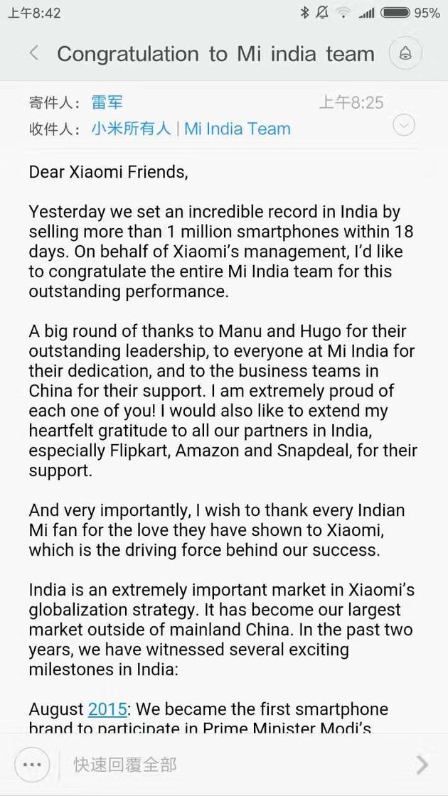 感謝 Hugo 和 Manu 的卓越領導,還有小米印度團隊所有同事的杰出貢獻,感謝各個中國業務團隊的鼎力支持,我深深地為每位同事感到驕傲。同時,我要感謝印度的每一位合作伙伴,尤其是Flipkart,Amazon 和 Snapdeal。