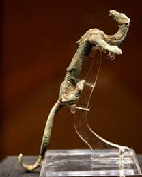 在海昏侯墓中,使用紡織品作裝飾的地方還有多處。在主槨室的東室東北部,也就是放置主棺槨處,出土了青銅帷帳帳鉤。(圖2)一般地說,帷帳是用細紗制成,既透風、透光,又擋蟲、擋塵,是南方的生活用品,也是貴族臥榻之上的奢侈品。漢詩中有“紅羅複鬥帳,四角垂香囊”的句子。此帳鉤長約一尺有餘,形如一只正在爬行的壁虎,惟妙惟肖。值得注意的是,這個帳鉤兩頭用於懸掛帷帳的鉤子都很小,如果用其懸掛如今的蚊帳,顯然因為鉤子太小無法掛住。這說明當時懸掛的帷帳是非常輕非常薄的,用很小的鉤子就能掛住。長沙馬王堆出土的一件素紗禪衣,長160厘米,兩袖通長190厘米,領口、袖頭都有絹緣,而總重量只有48克,紗的細韌程度是可想而知的,說明那時的織造技術已經達到了相當精細的水平。