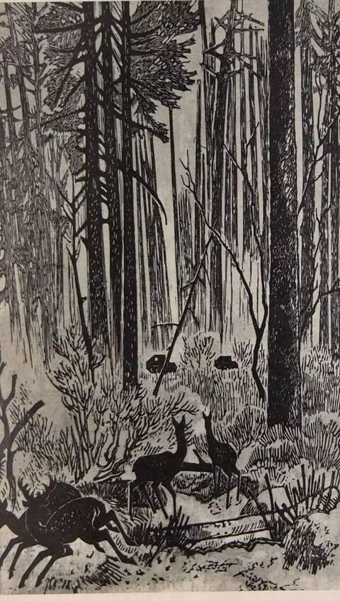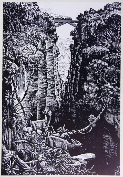這幅畫描繪火車第一次從深山叢林中的高架橋上通過時,汽笛一鳴,驚動了山林中的住戶們——野鹿亂跑,群鳥起飛,以表現祖國建設的新氣象。畫家以細膩的刀法和清晰的調子刻出了我國南方大山中的繁茂的森林和美麗的草叢。