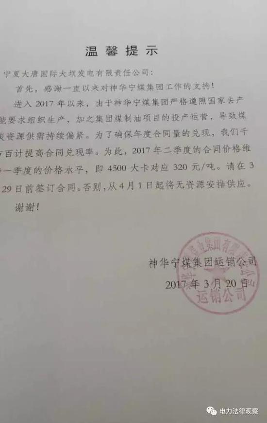 3月20日,神华宁煤集团运销公司向多家火电企业发出“温馨提示”称,二季度的合同价格维持一季度价格水平,即4500大卡对应320元/吨,对29日前未签订合同者停止供应。