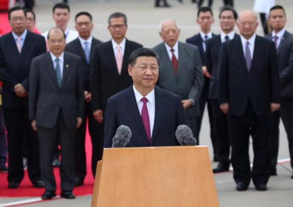 2017年6月29日中午,習近平乘坐專機抵達香港,並在香港機場發表講話。習近平在講話中指出:「回顧香港20年不平凡的歷程,總結經驗,展望未來,確保『一國兩制』行穩致遠。」