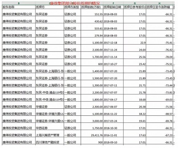 中国基金报记者根据wind数据,统计出最近3年内质押的情况(未见公告解除质押),东吴证券、中信建投证券、华福证券、华西证券,以及中泰信托、中原信托等机构都有康得集团质押的股份在手。