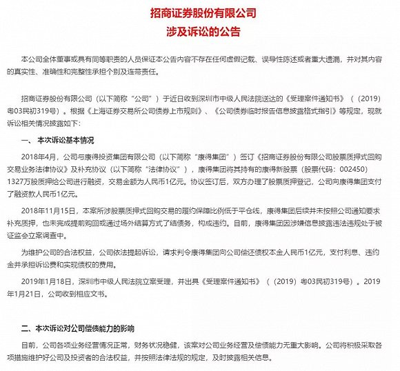 今日晚间,招商证券发布公告称,公司近日收到深圳市中级人民法院送达的《受理案件通知书》,公司依法对康得集团提起诉讼,请求判令其向招商证券偿还债权本金人民币1亿元,支付利息、违约金并承担诉讼费和实现债权的费用。