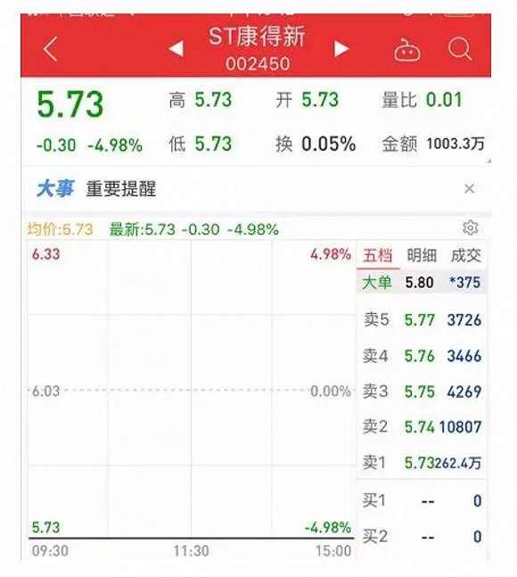 被ST之后,ST康得新今日复牌,股价无量一字跌停。今日收盘报5.73元,跌幅4.98%,成交额仅为1003万元,总市值仍有203亿元。盘中一度逾300万手卖单压顶,到收盘卖单仍有262万手。