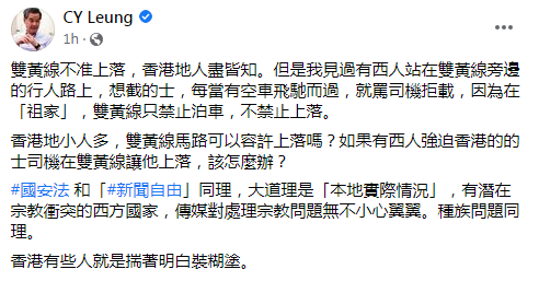 梁振英語帶雙關地指出,雙黃線不准上落,在香港人盡皆知。但是其曾見過有西人站在雙黃線旁邊的行人路上,想截的士,每當有空車飛馳而過,就罵司機拒載,因為在「祖家」,雙黃線只禁止泊車,不禁止上落。而國安法和「新聞自由」同理大道理是「本地實際情況」,有潛在宗教衝突的西方國家,傳媒對處理宗教問題無不小心翼翼。種族問題同理。