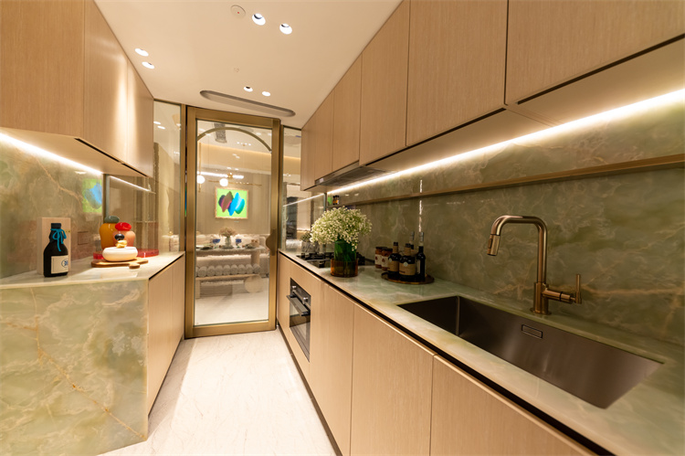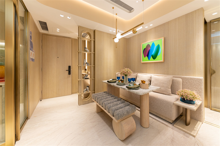 單位兩房,實用面積770平方呎。胡致遠表示,設計師改動了玄關原有的高身儲物櫃,令空間更見寬敞;客飯廳牆身以溫潤色調的木飾面鋪砌,配上灰色雲石檯面的餐桌,襯以設計師品牌沙發、綠色雲石茶几以及線條圖案的扶手椅,設計精簡乾淨,充滿生命力,張力十足。