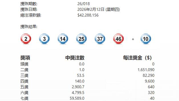 今晚(12日)進行的第018期六合彩攪珠,總投注額逾4228萬元,攪珠結果為2、3、14、25、37、46及特別號碼10,頭獎無人中;二獎有1注中,每注派$1,651,090;三獎則有53.5注中,每注派$82,290。