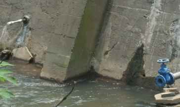 图为从水口山矿务局冶炼八厂里面延伸出来的沟渠、管道连接小溪,这条小溪水最终流入几里外的湘江