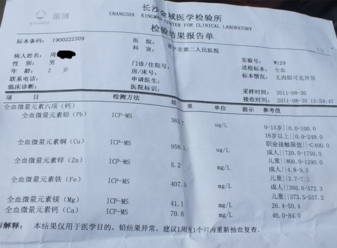 图为水口山街道常青居委会一位居民提供其孙子的验血化验单,显示全血微量元素铅和锌超标严重。