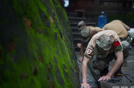 老李帶領的“老兵之家”隊伍半跪在石板上,用鋼刷使勁擦洗地面。第一塊由青黑老舊變得光潔如新的石磚他們擦了36000下。這是“老兵之家”到白沙井清洗的第4天,井台一半的石磚已清洗幹淨,刷壞了20多把鋼刷。老李一邊淘水道一邊說:“水道裏的苔蘚好幾十年了,屬於頑漬,比地板要難刷,我估計還要一個月才能搞幹淨。”