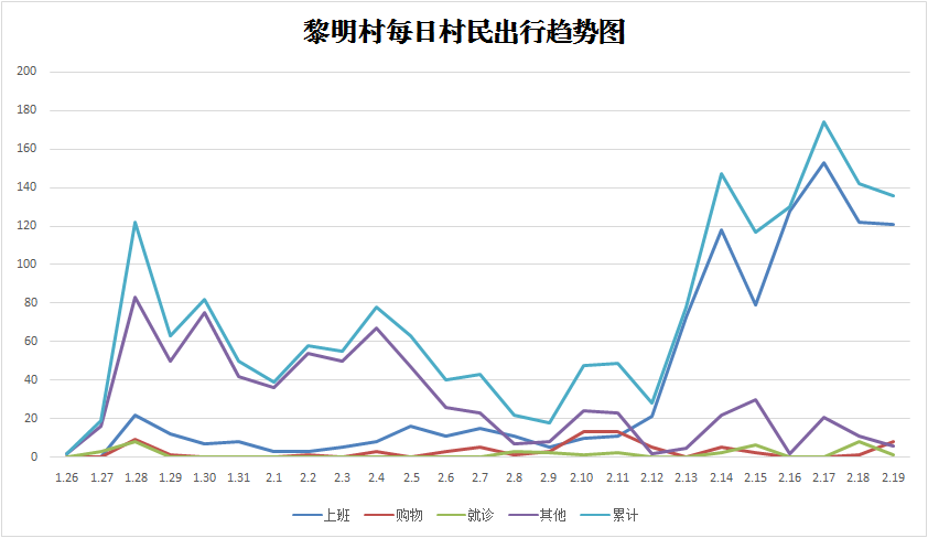 在各村的每日村民出行趨勢圖上,有累計、上班、購物、就診、其他共五條曲線,曲線峰值低的,說明村民外出少,管控措施得力,曲線峰值高的,說明這類出行人員還有現實需求,各村要立即找差距看不足,馬上改進。通過這幾條折線,分析出行變化,從而對出行原因比較集中的人群採取更具針對性和可操作性的措施進行管理。而「累計」這條曲線則是為全面把握出行村民的總體情況,對封村以來出行村民數據進行匯總分析,依據曲線波動和關鍵轉折點,全面分析鎮域防控工作的難點和重點,通過動態監測、分析,不斷調整相應的防控措施,使全鎮疫情防控工作更加有序、有力、有效。
