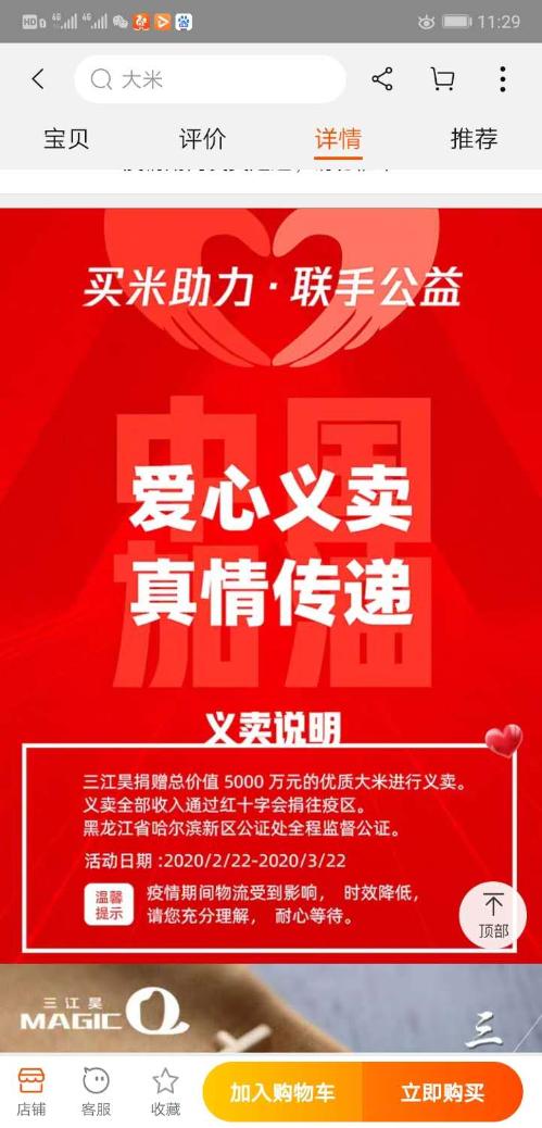 打開手機淘寶,記者看到在天貓商城三江昊米業旗艦店,標價396元一箱的義賣大米已經成交2單。據介紹,義賣活動在天貓商城三江昊米業旗艦店及京東商城兩家電商平台進行,為期一個月,即2月22日0時至3月22日24時。在活動截止日期之前,如果5000萬元的大米全部銷售完,則宣布活動結束;活動日期屆滿,尚未全部銷售完,則以實際銷售額為準。(張桂英 張曉磊)